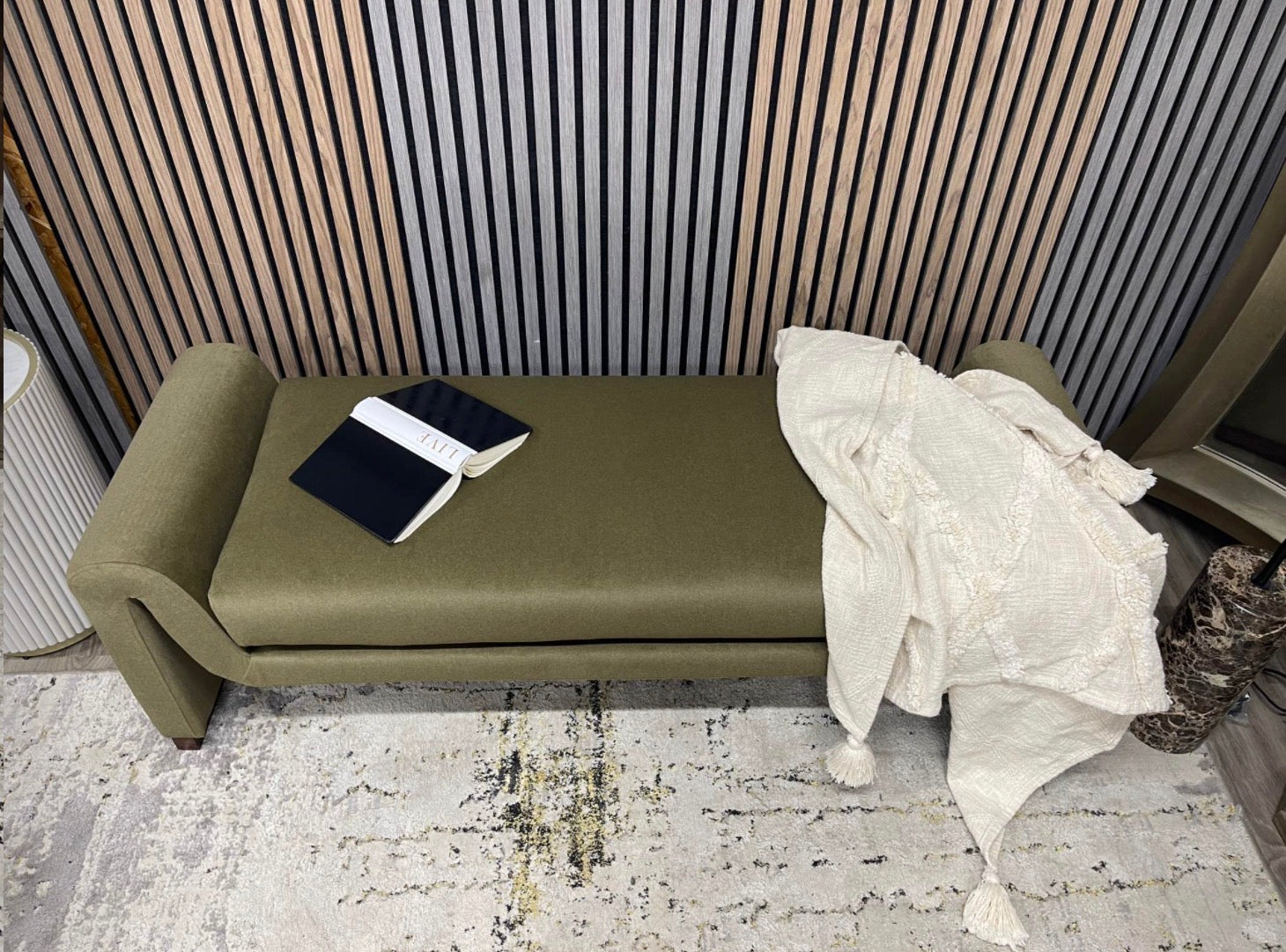 Brand new Cult Furniture Bennett bench, the perfect blend of modern design and luxurious comfort. With its curved, flowing silhouette and soft mohair-style velvet upholstery in moss green, it's a true statement piece. The padded seat offers exceptional comfort whether placed in a living room, hallway, or bedroom.
