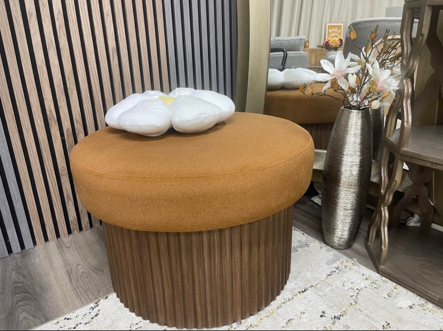 Minimaluxe and sculptural, Alexis cylindrical stool in caramel brown has a blend of soft mohair velvet and a ribbed wooden base in a walnut stain, revealing a spacious storage compartment.