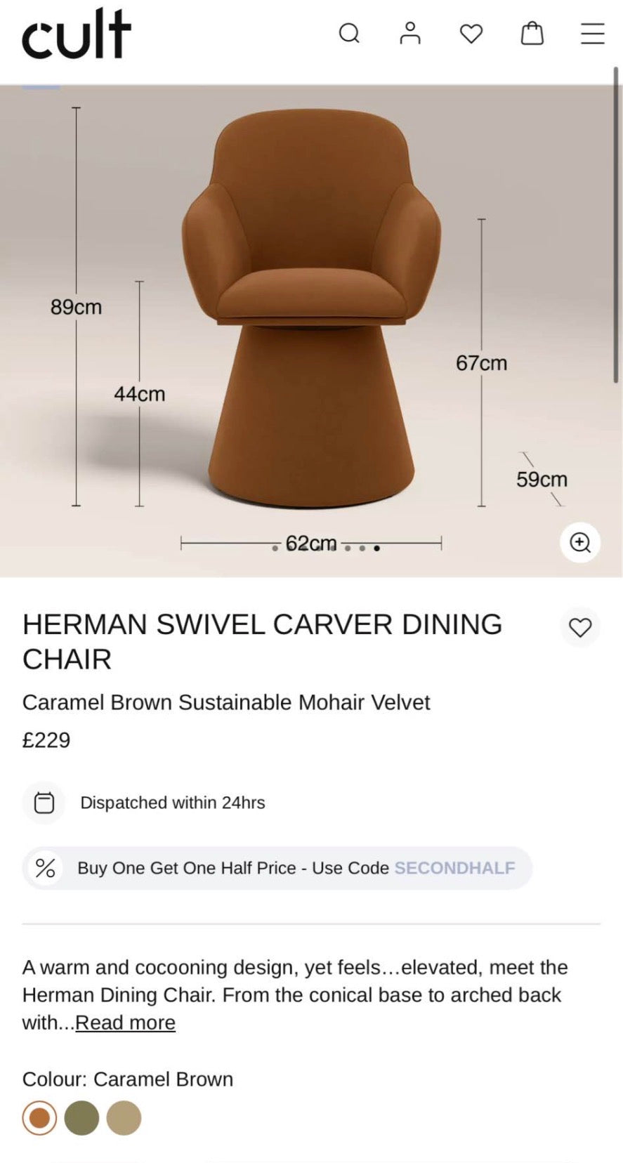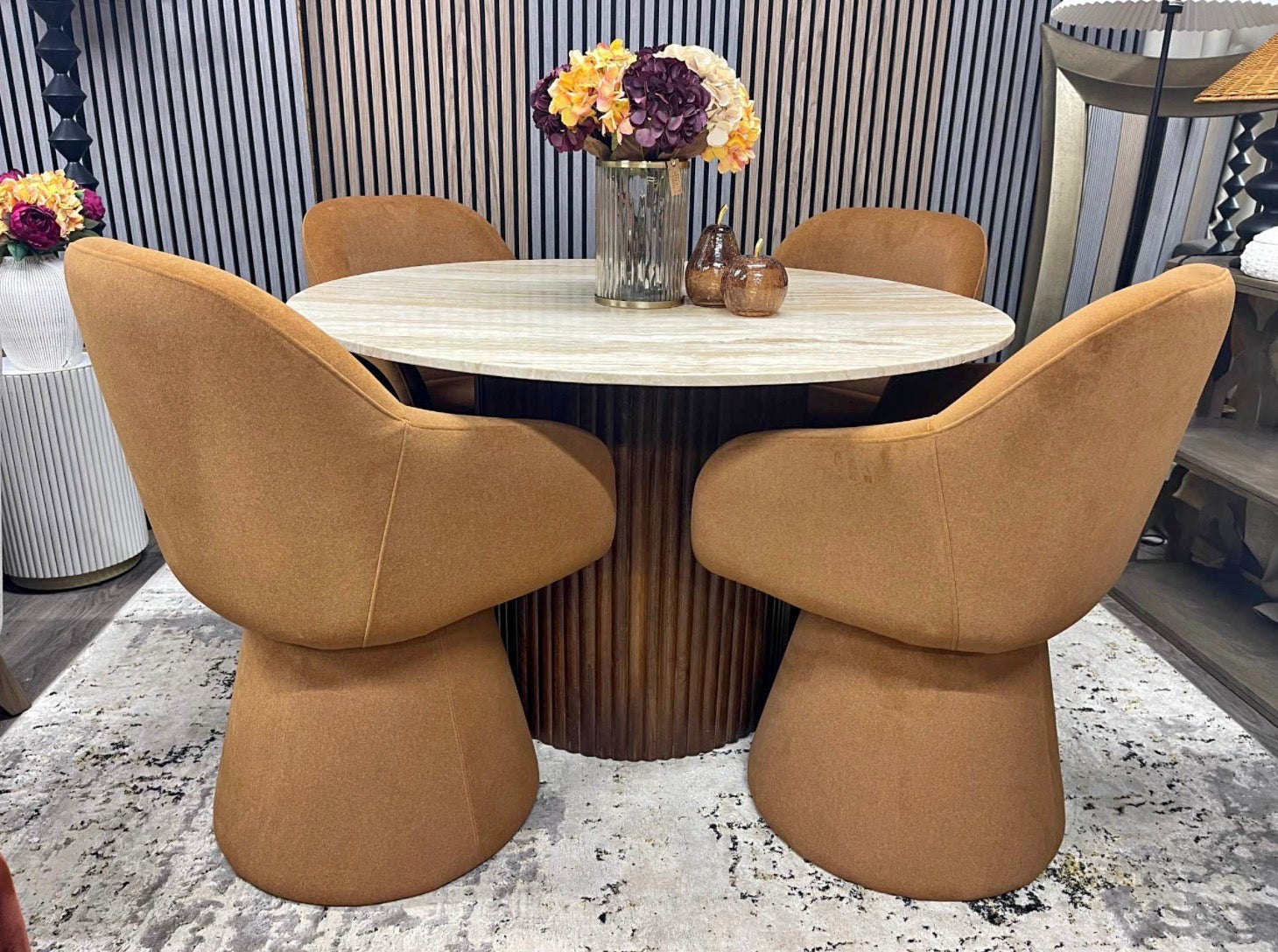 Brand new Cult Furniture Medby natural travertine and walnut round dining table and 4 Herman swivel carver dining chairs in caramel brown mohair velvet.