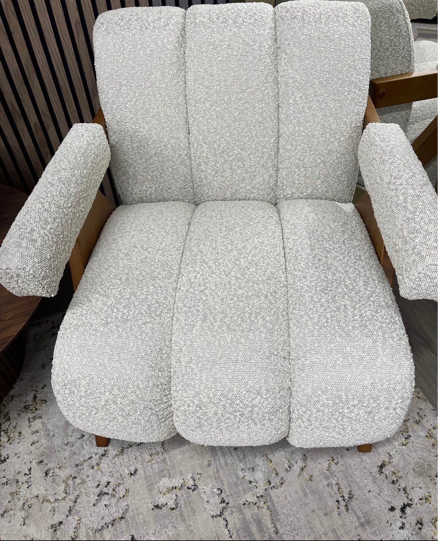Brand new Cult Furniture set of 2 Paulo speckled stone boucle armchairs with padded armrests and a sturdy walnut stained frame for definition and refined design.