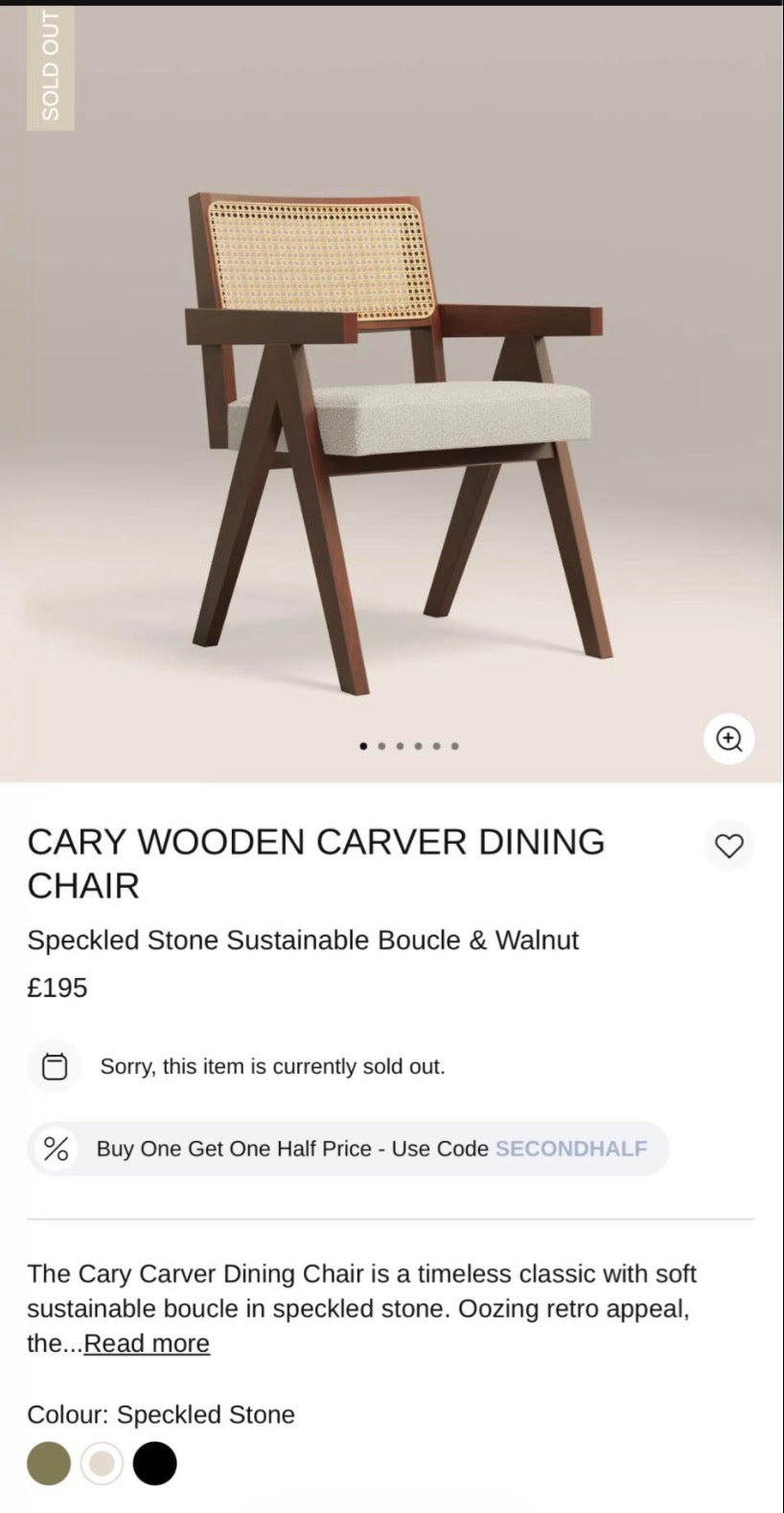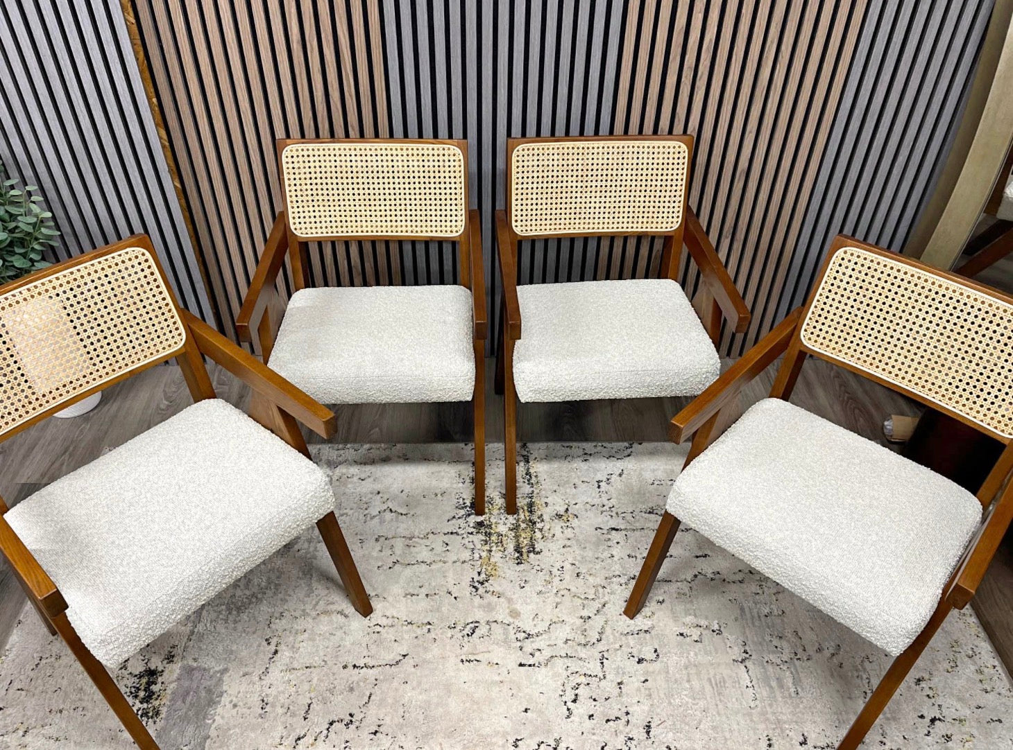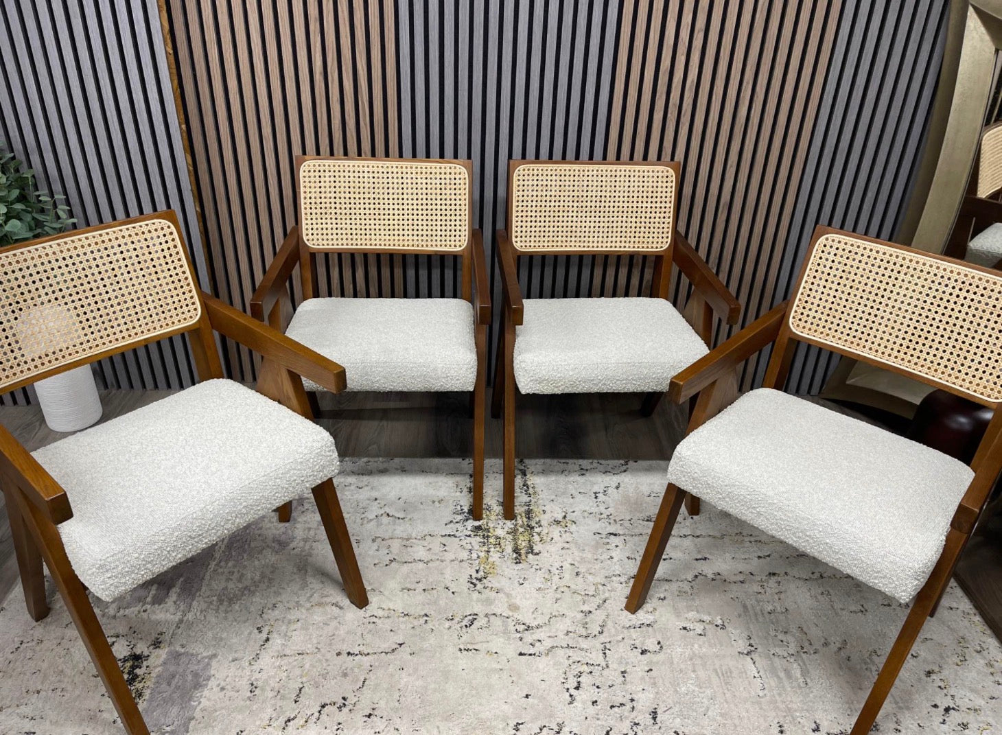 Brand new Carry wooden carver chairs with walnut finish, featuring a rattan backrest and sustainable speckled stone boucle.